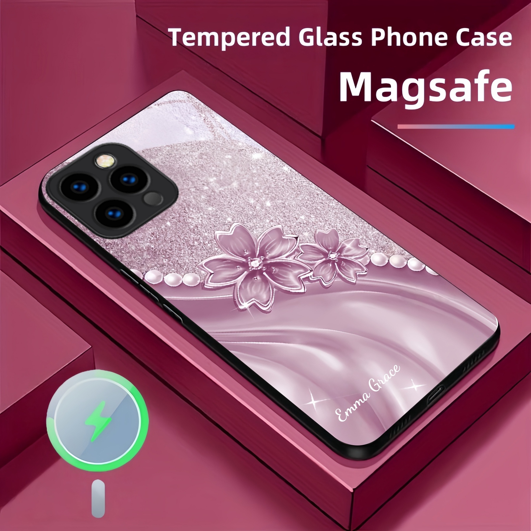 Personalized Glitter Pearl Peach Blossom Magsafe Tempered Glass Case