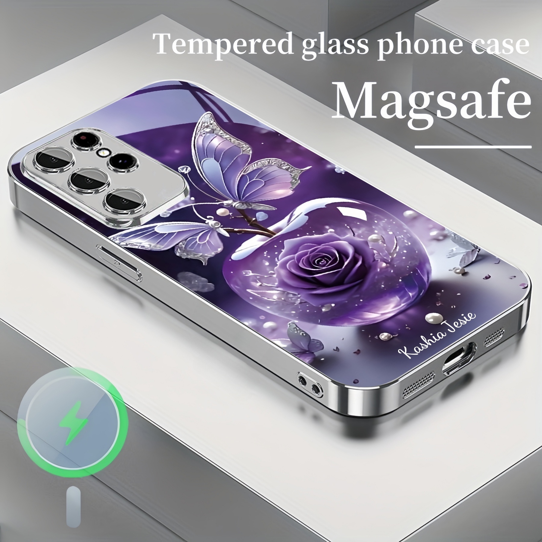 Personalized Purple Rose Butterfly Magsafe Tempered Glass Plating Case