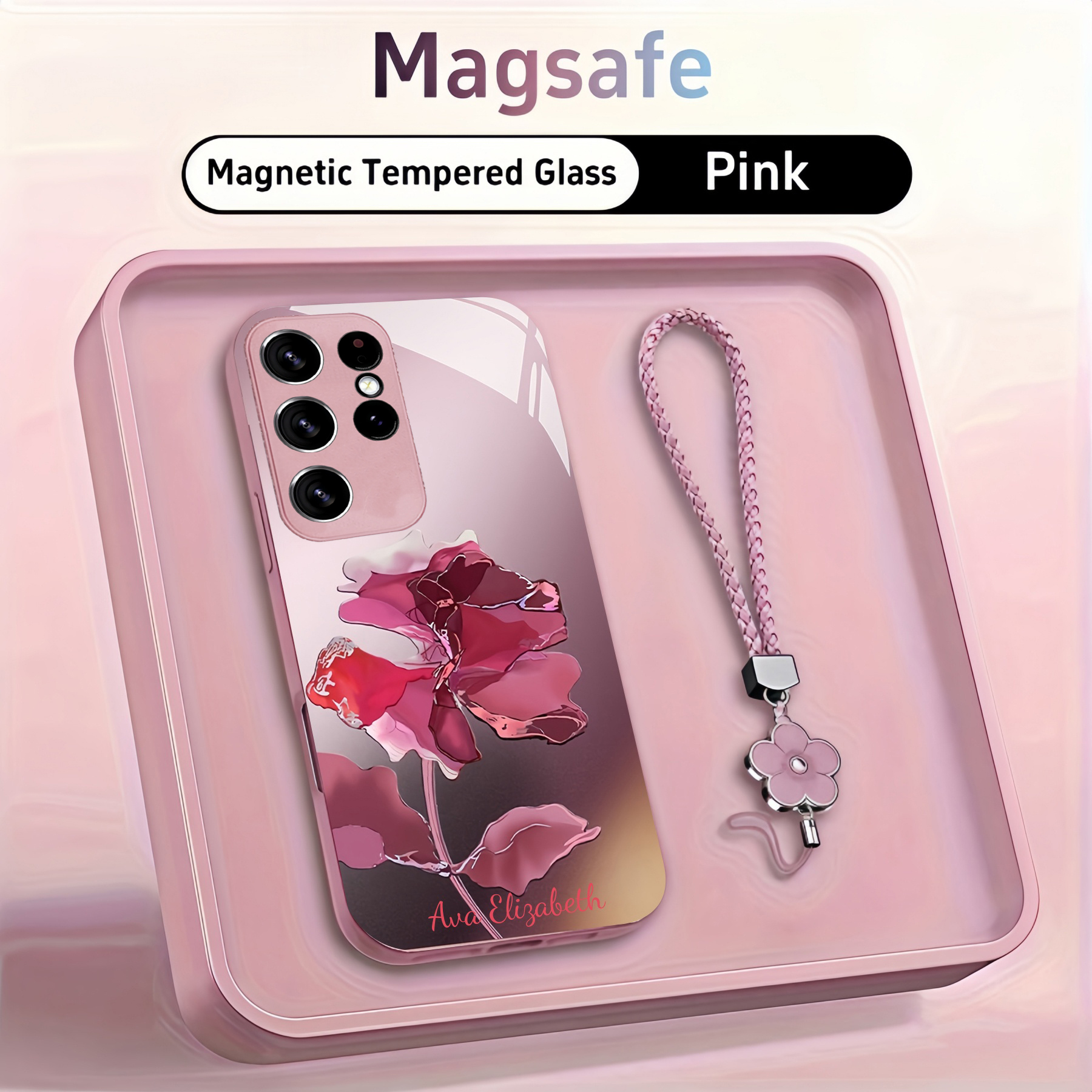 Personalized Marble Flowers Magsafe Tempered Glass Case with Lanyard