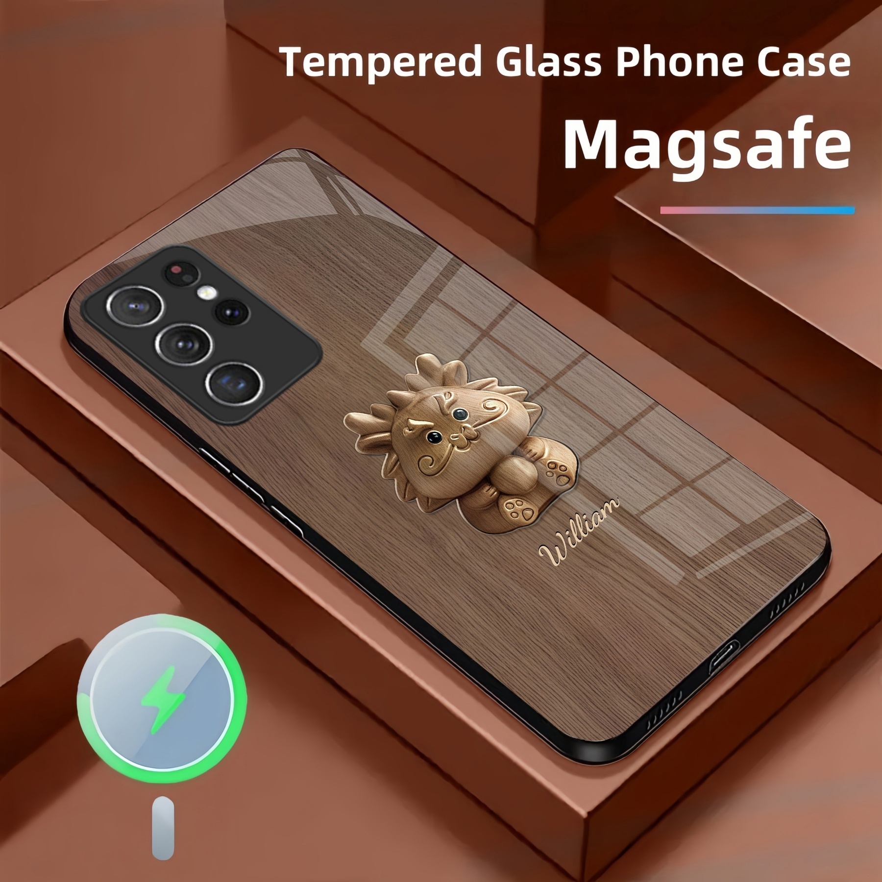 Personalized Cute Dragon Wood Grain Magsafe Tempered Glass Case